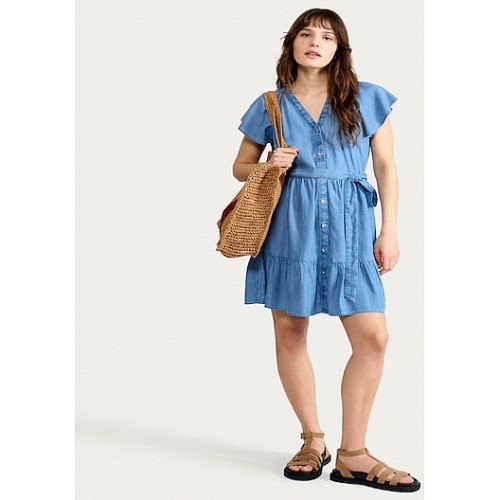 Pure Lyocell Button Front Tie Waist Mini Dress in Blue