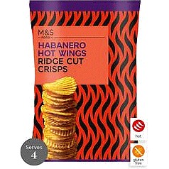 M&S Habanero Hot Wing Ridge Cut Crisps: sizzling chicken flavour with fiery Habanero chilli marinade, chilli rating - hot - 3, British potatoes, gluten free, suitable for vegetarians, made in UK