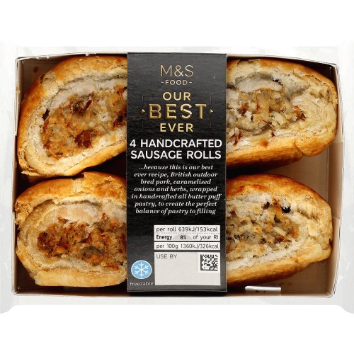 Four sausage rolls made with British outdoor bred pork, caramelised onions and herbs, wrapped in all-butter puff pastry