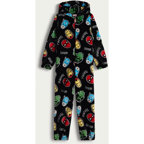 Marvel Heroes Print Fleece Hooded Onesie in Black