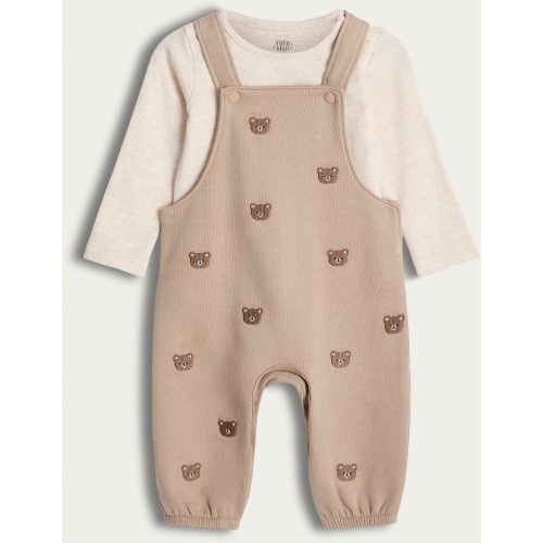 2-Piece Cotton Rich Bear Embroidered Dungaree and Bodysuit Set in Stone