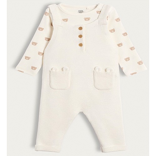 Bear Print Bodysuit and Knitted Dungaree Set in White
