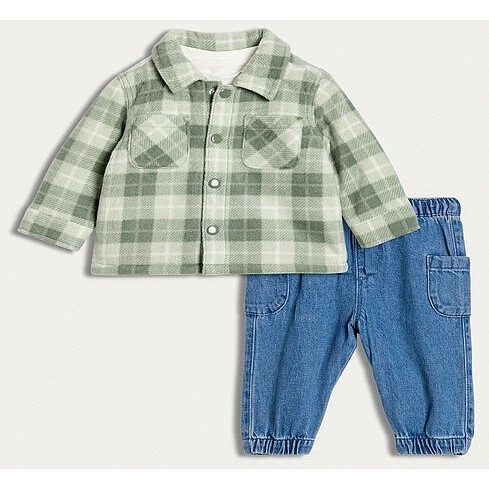 3-Piece Check Shacket Tee & Jeans Set in Green