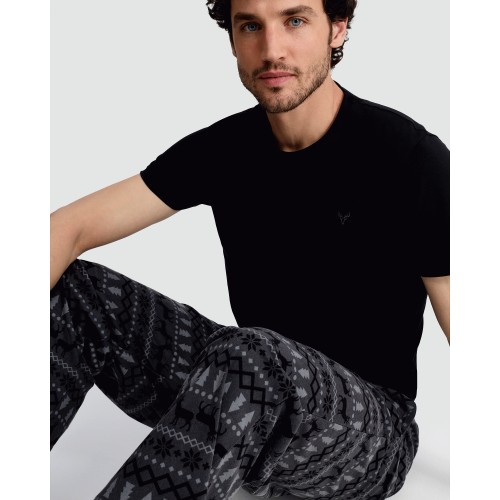 Pure Cotton Top and Fleece Patterned Pants Pyjamas in Black