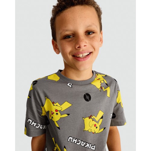 Pokemon Pikachu Print Pure Cotton Short Sleeved T-Shirt in Grey