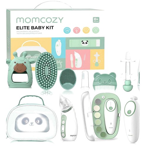 Includes baby grooming tools like nasal aspirator, nail scissors, clipper, file, gas relief tubes, bath brush, cradle cap brush, finger toothbrush, and comb.