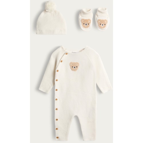 3-Piece Pure Cotton Knitted Bear Romper Hat and Bootie Set in White