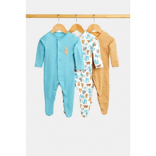 Pure Cotton 3-Pack Bear and Stripe Print Sleepsuits in White