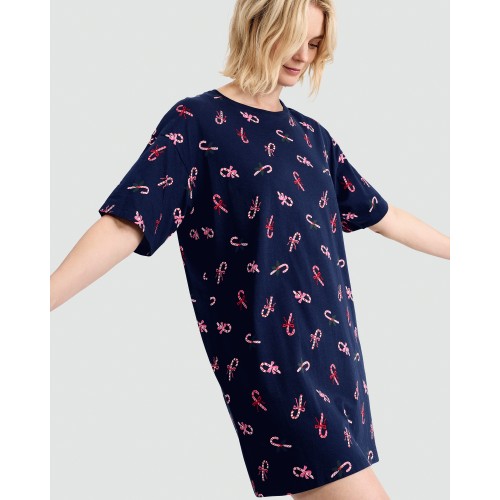 Pure Cotton Candy Cane Print Nightdress in Navy