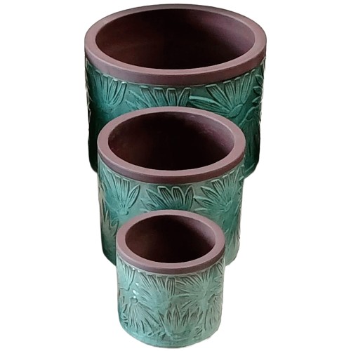 Green Floral Set Of 3 With Choc Rim Pot Planters