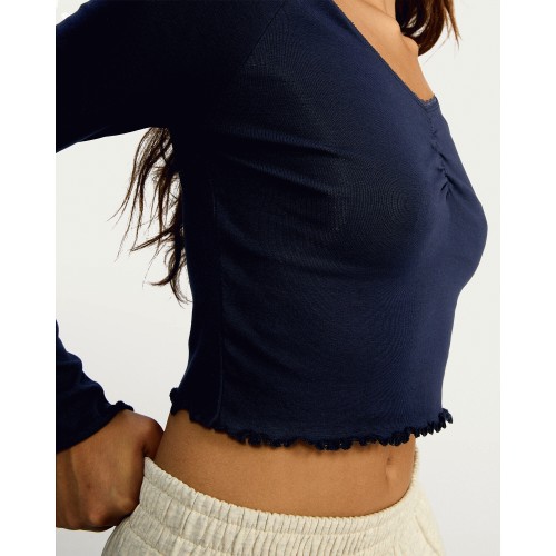 OH ME OH MY Cotton Rich Ruched Lace Trim Top in Navy