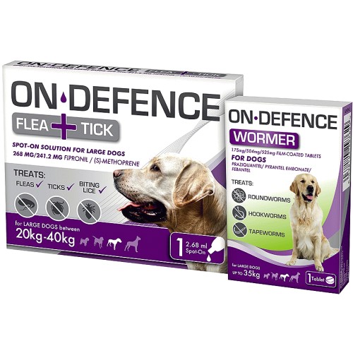 Bundle For Large Dogs (20.01Kg-35Kg) Wormer Tablet And On-Defence Flea And Tick Spot On Solution