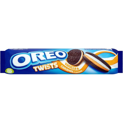 Cocoa sandwich biscuits with vanilla and caramel flavour filling