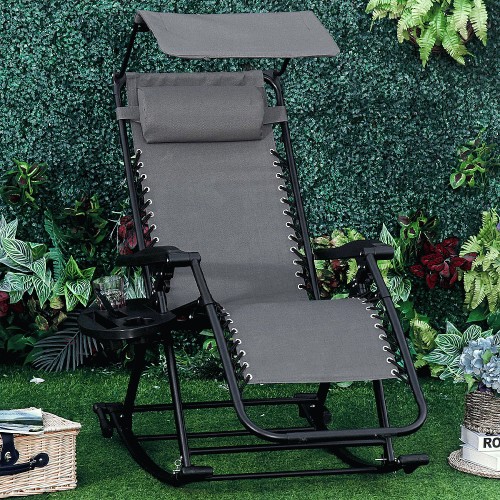 Grey Zero-Gravity Foldable Recliner Garden Rocking Chair with Canopy