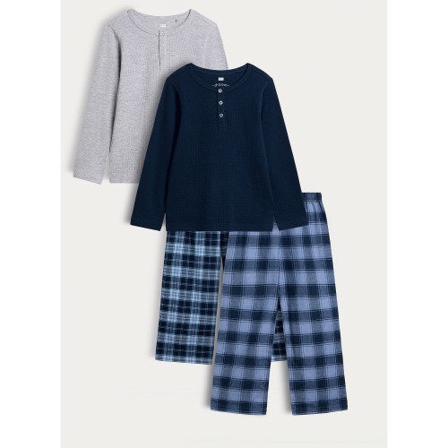 Boys 4-Piece Pure Cotton Waffle Top and Check Bottoms Pyjama Set in Blue