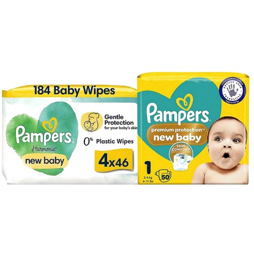 Premium Protection New Baby Size 1 & New Baby Harmonie Wipes Bundle