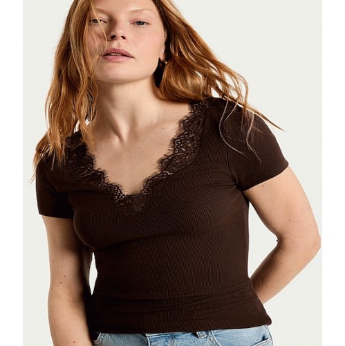 Lace Trim V Neck Short Sleeved Top in Brown