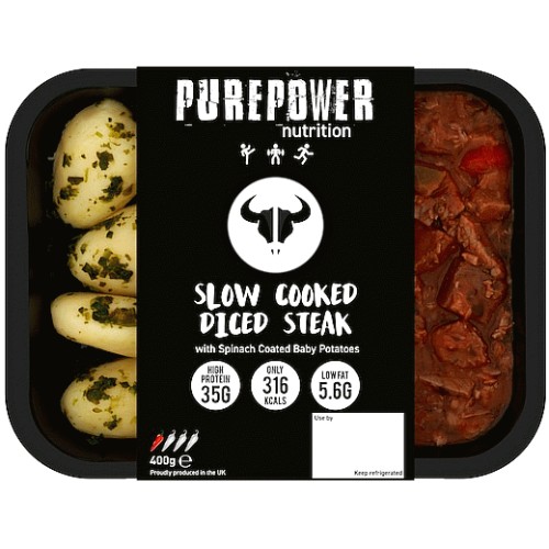SLOW COOKED DICED STEAK WITH SPINACH COATED BABY POTATOES