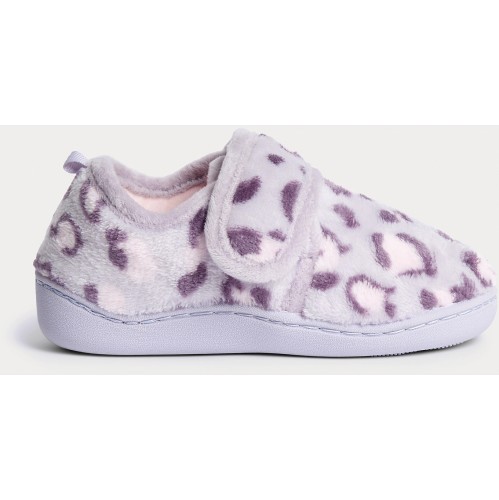 Girls Fluffy Leopard Print Strap Fastening Slippers in Lilac