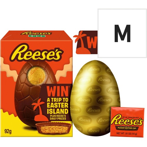 Egg comes with 2 milk chocolate cups, 2 white chocolate cups, and a peanut butter creme egg.
