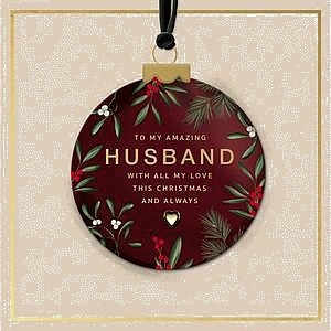 Christmas to My Amazing Husband Christmas Bauble with Heart Design Greeting Card