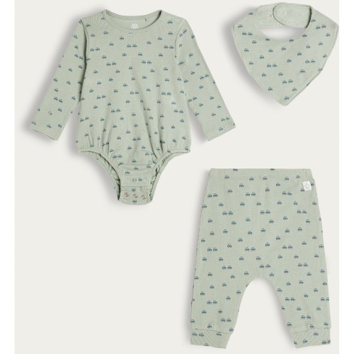 3-Piece Cotton Rich Car Print Bodysuit Legging and Bib Set in Green