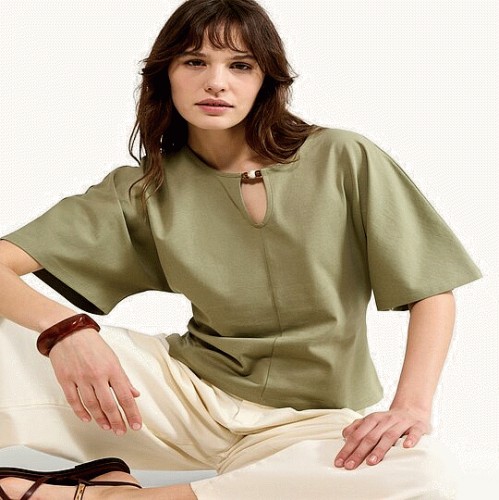 Pure Cotton Keyhole Detail Short Sleeved T-Shirt in Green