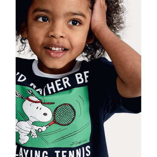 Snoopy Pure Cotton Tennis Graphic Short Sleeved T-Shirt in Navy