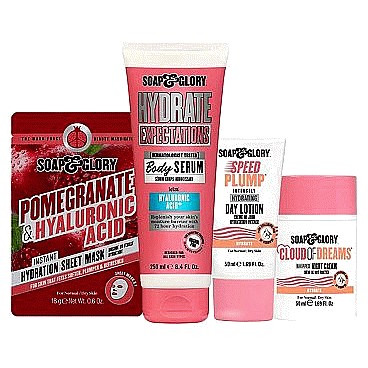Bundle includes 1 cherry wild body wash (250ml), 1 cherry wild body lotion (250ml), 1 plumping lip gloss (red over heels), 1 pomegranate & hyaluronic acid sheet mask