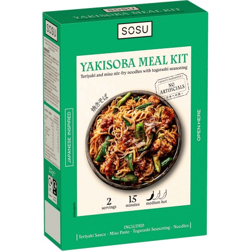Meal kit with miso paste, teriyaki sauce, togarashi seasoning and noodles