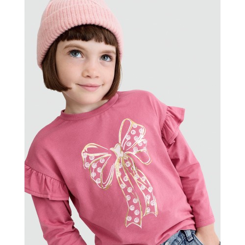 F&F Girls Pure Cotton Bow Print Long Sleeved Top in Burgundy