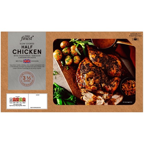 Slow cooked British 1 2 Chicken basted with Chicken stock with a Chardonney Tarragon & Mushroom sauce