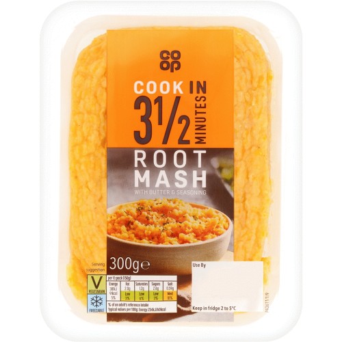 Potato with carrots, parsnip and swede mashed with milk and butter.