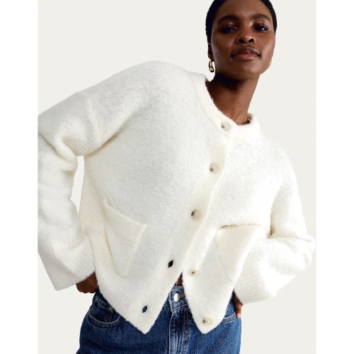 Boucle Textured Button Front Cardigan with Wool in Cream