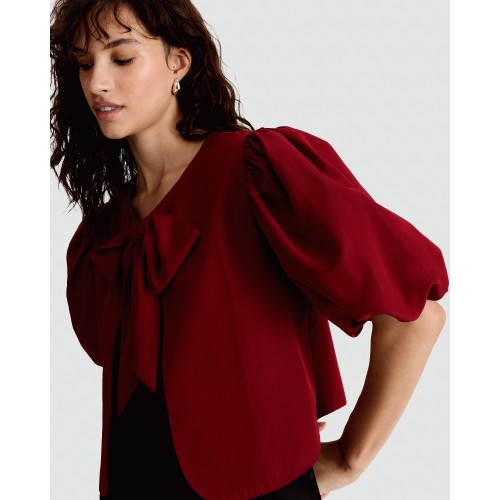 Sheer Puff Sleeved Bow Front Blouse in Burgundy