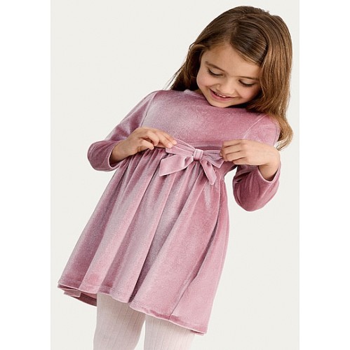 F&F Girls Faux Velvet Bow Detail Long Sleeved Dress in Pink