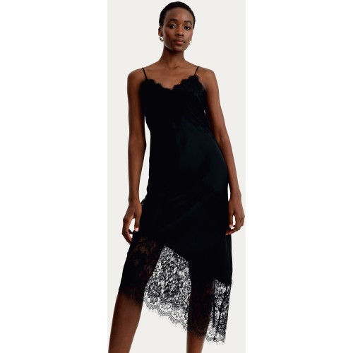 Satin Lace Trim Asymmetric Hem Midi Slip Dress in Black