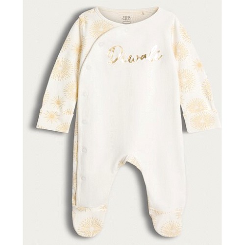 Pure Cotton Diwali Print Long Sleeved Sleepsuit in White